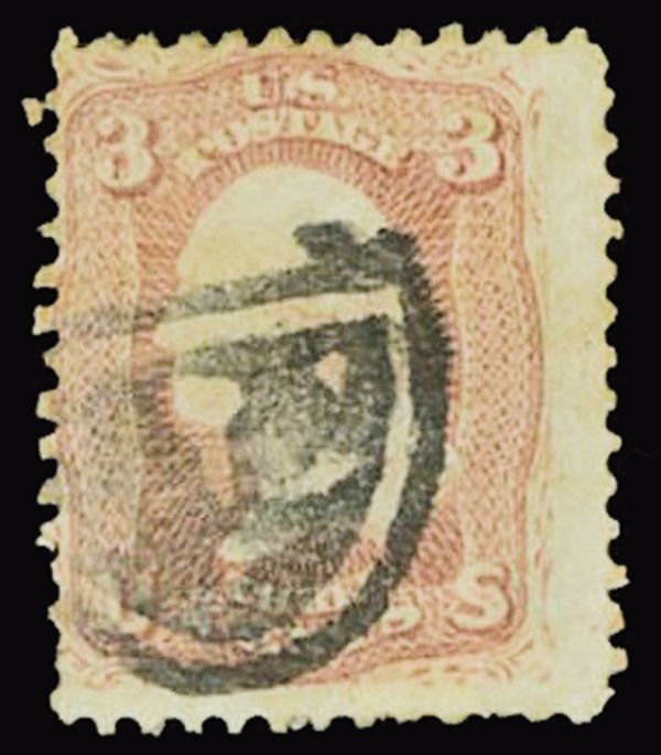 Padlock (Rohloff O-10), near-complete strike on 3c Rose (65), stamp centered to upper left, small thin at lower right, a scarce and desirable strike, fine.