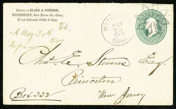 Rosette, Eight Hollow Segments, Type 2 (Rohloff P-26), beautiful strike on 3c Green postal stationery entire, matching "Waterbury Conn May 29" circular datestamp, to Princeton, New Jersey, one of the scarcer Rosettes, with Rohloff recording no more than eight examples, extremely fine.