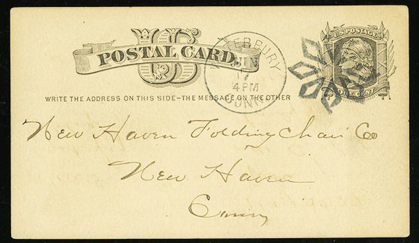 Rosette, Eight Hollow Segments, Type 2 (Rohloff P-26), full strike on 1877 1c Black postal card (UX5), "Waterbury Conn. Jun 17" circular datestamp, to New Haven, Connecticut, very fine.