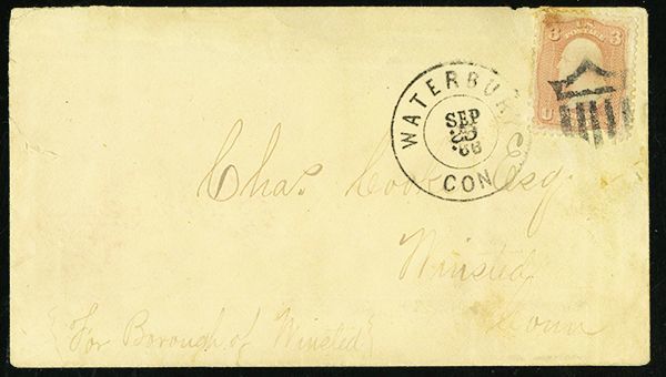 Shield, Five Bars, Pointed Closed Top, Type 2 (Rohloff Q-2), bold strike ties 3c Rose (65) on cover to Winsted, Connecticut, matching "Waterbury Con Sep 28 66" double circle, stain at upper left of stamp, a small faults to edge and back flap, a pleasing example of this rare and popular fancy cancel.