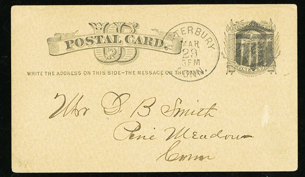 Shield, Five Bars, Solid Top (Rohloff Q-6), bold strike on 1878 1c Black postal card (UX5), matching "Waterbury Conn. Mar 29 3PM" c.d.s., to Pine Meadow, Connecticut, an ideal strike of this popular fancy cancel, extremely fine.