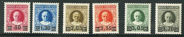 40c on 80c-3.70l on 10l Overprints, hinged, several with hinge remnants, fresh bright colors, attractive and scarce with such select centering, very fine; with 2020 Sismondo certificate. (Sc. 35-40, $1,565)