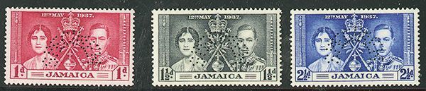 British Commonwealth group of better mint sets and singles, with a wide range of countries, with Bahamas, Bermuda, and Jamaica KGVI Coronation SPECIMEN perfin sets, the latter never hinged, British Honduras #84 used, Cayman Islands #50-63, India 150/67 complete save for 161A, Great Britain #122, Nyasaland #23 (slight disturbed gum), St. Helena #118-27, Malaya (Trengganu) #20-37, and Malaya J7-12, a mostly well-centered and fresh group, with many desirable items, fine-very fine.