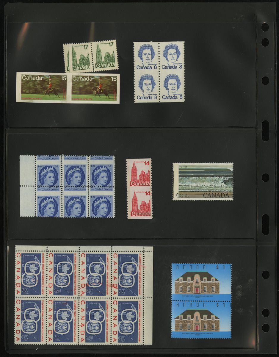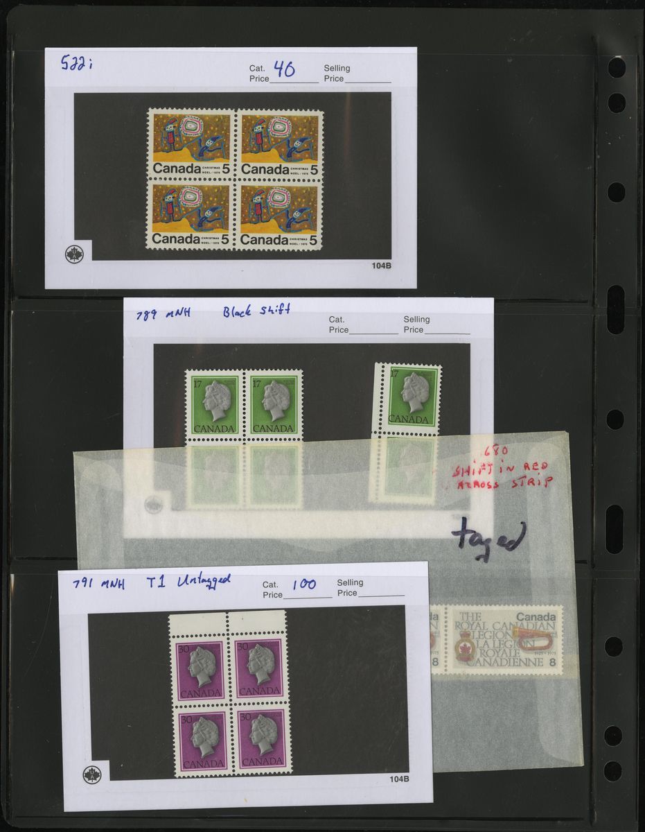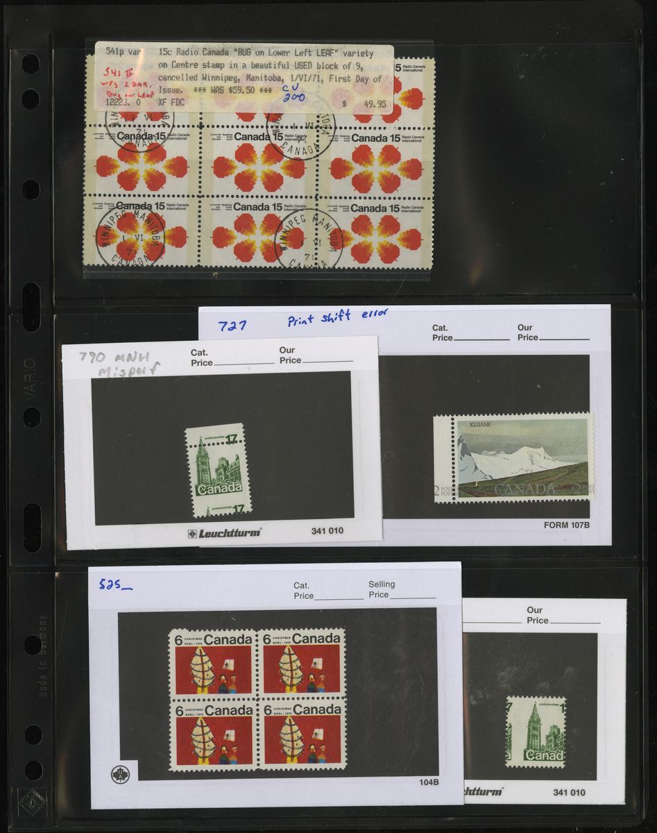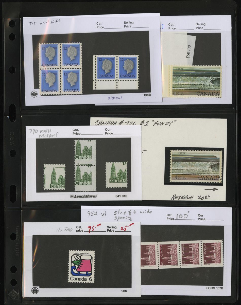Canada QEII Errors & Varieties collection, of a couple dozen items, with several better, noting 8c Caricature imperf between block, 15c Mountie imperforate pair (typical small faults), 5c Wilding plate block showing the "cracked plate" variety, several 17c Parliament misperforated examples, one horizontal pair with a dramatic pre-printing paper crease, 8c Legion with shifted red strip, 5c St. Lawrence Seaway block of eight with red ink smear, 15c Radio Canada block with first day cancel and showing the "Bug on Leaf" variety, $1 Fundy and $2 Kluane with shifted inscriptions, 5c Wilding with dramatic misperforation, various tagging errors, etc, an ideal lot for the specialist.