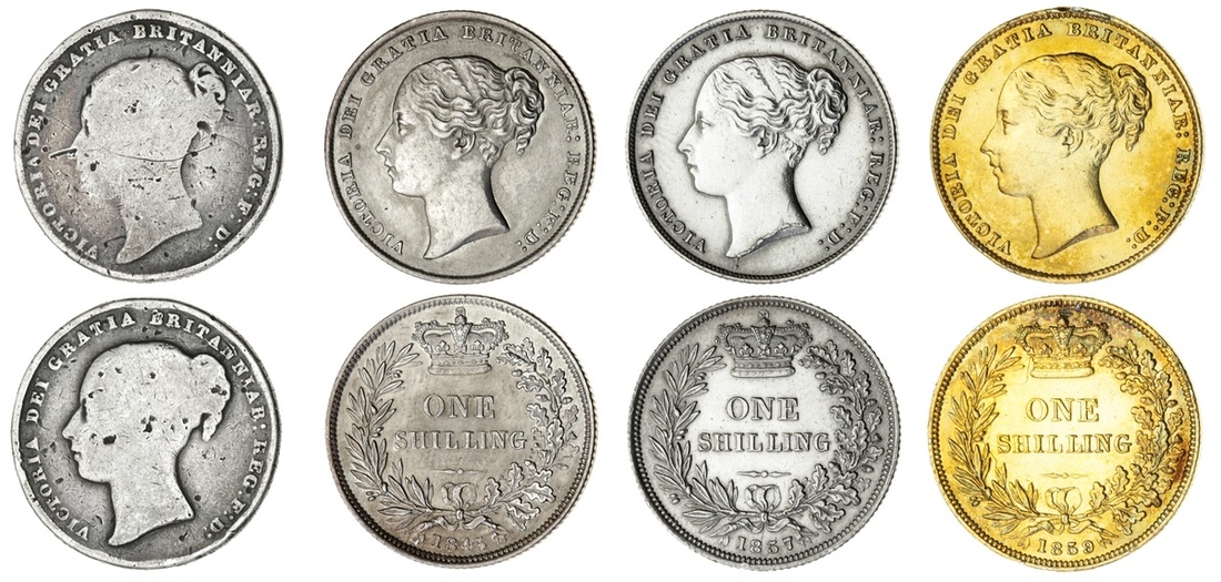 Victoria (1837-1901), Shillings, curiosities (4), fabricated two-headed mule, type A1/A3 (S.3902/3904); others, type A3 (3), 1845 (Davies 859; ESC 1292), once cleaned, now retoned, otherwise a bold very fine; 1857 (Davies 871; ESC 1305) die break along truncation and once cleaned, otherwise extremely fine; also, 1859, type A3, gilt and mounted, probably to pass as a Sovereign (Davies 879, die set 4+A; ESC 1307; S.3904); also, "To Hanover" Tokens (2), very fine (6)