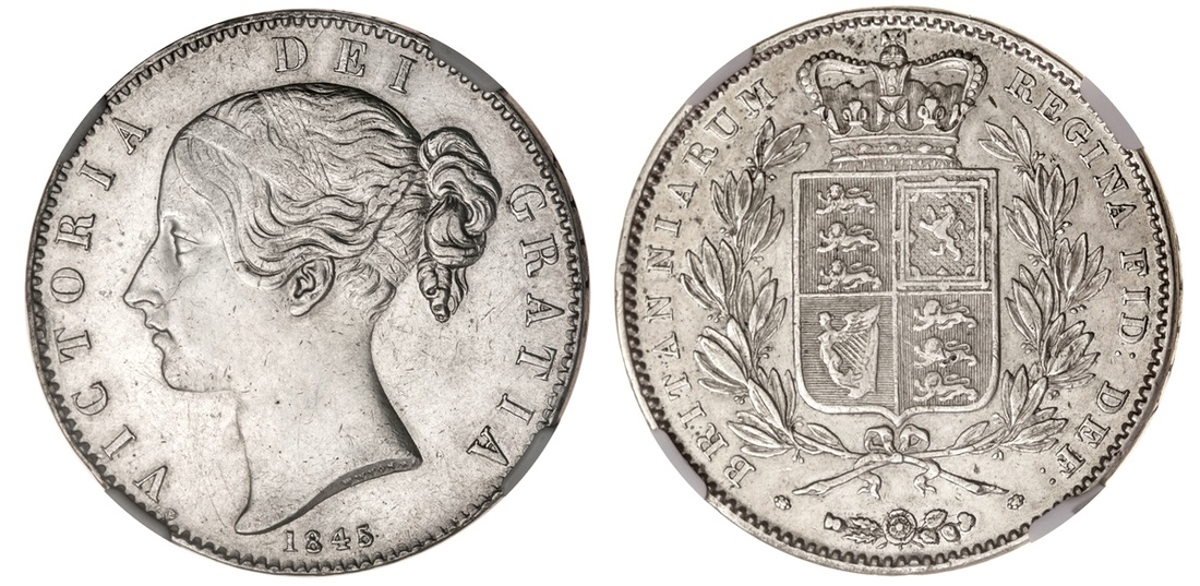 Victoria (1837-1901), Crown, 1845, cinquefoil stops, young head left, rev. crowned shield in wreath (S.3882), cleaned, otherwise near very fine