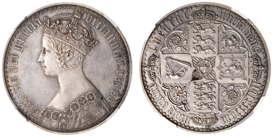 Victoria (1837-1901), Proof Crown, 1847, 'Gothic' bust left, rev. crowned cruciform shields, emblems in angles, edge plain (S.3883), a gentle tone muting otherwise brilliant surfaces, good extremely fine in NGC holder, graded PF61