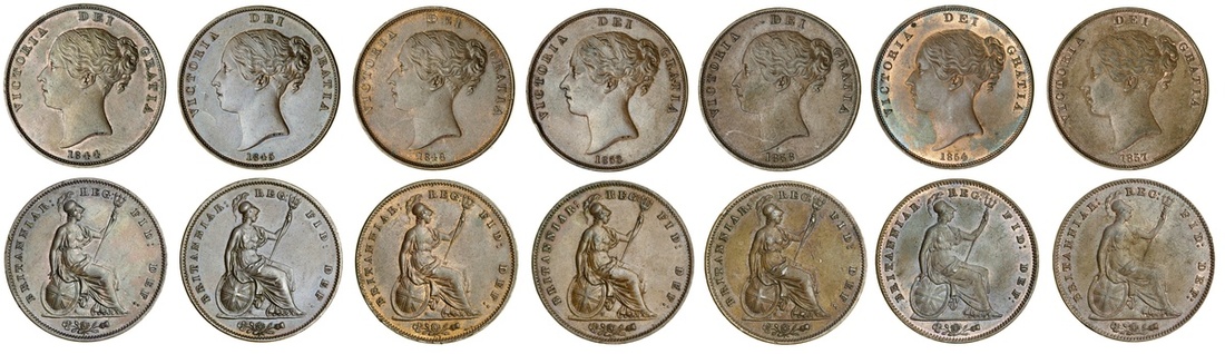 Victoria (1837-1901), Pennies (7), ornamental trident, 1844, 1845, 1848, 1853 and 1858, plain trident, 1854 and 1857, young head left, rev. Britannia seated (S.3948), some lustrous, otherwise generally about extremely fine or better (7)