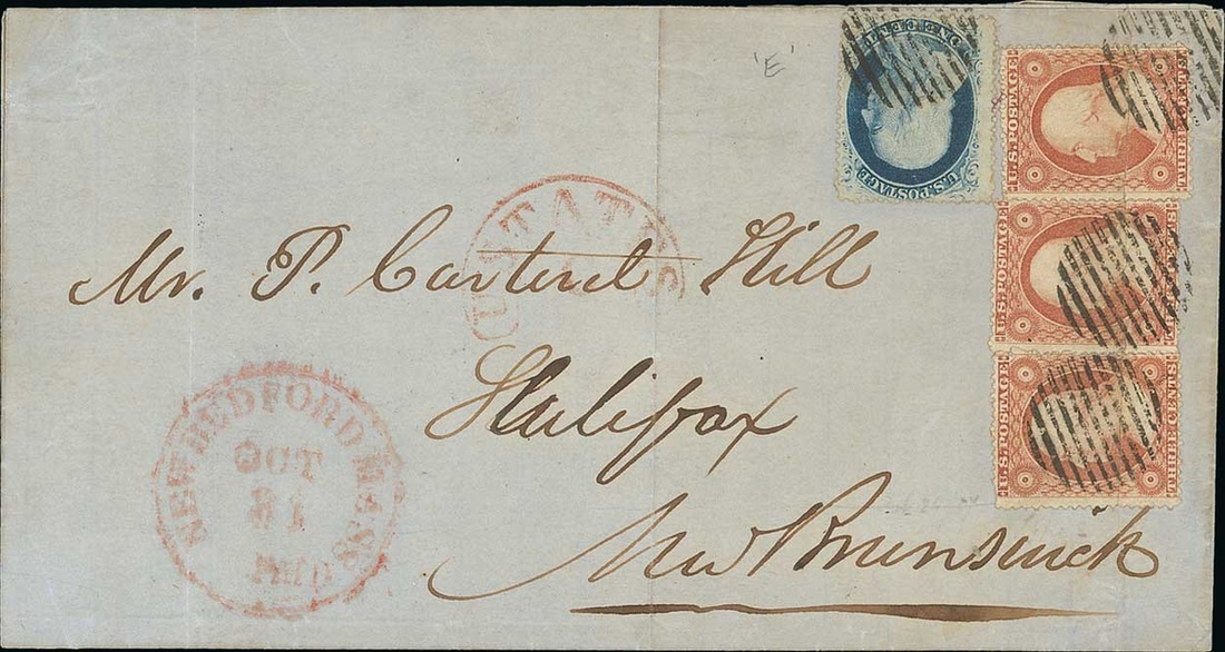 1859 (31 Oct.) entire from New Bedford, Mass. to Halifax, bearing 1857-61 1c. blue and 3c. red-brown strip of three cancelled and tied by circle of bars, showing despatch datestamp at left and horseshoe-framed "