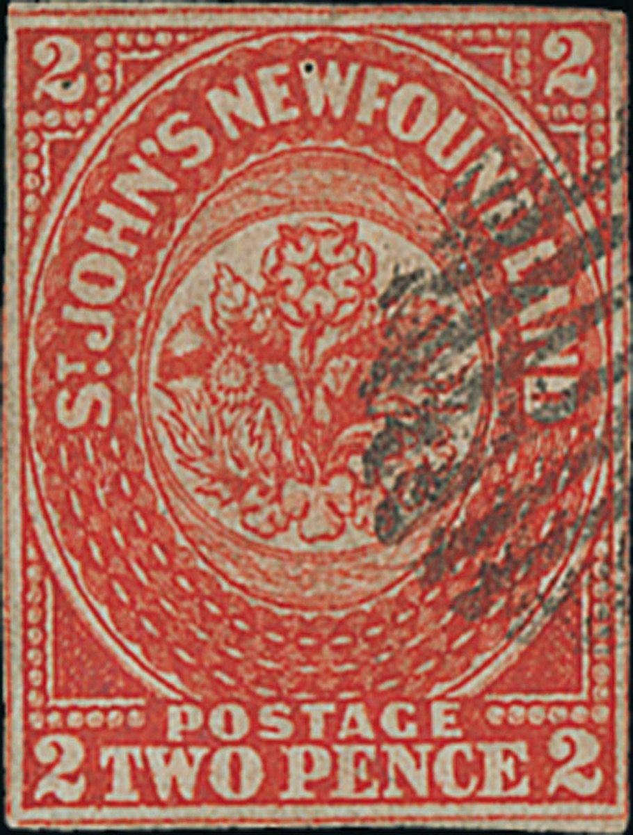 2d. scarlet-vermilion with small margins in places or outer frameline touched, small part oval of bars cancellation leaving much of design clear; small thin and traces of creasing though a presentable example of this rare stamp. R.P.S. Certificate (1994). Sc. 2; S.G. 2, £6,500. Photo