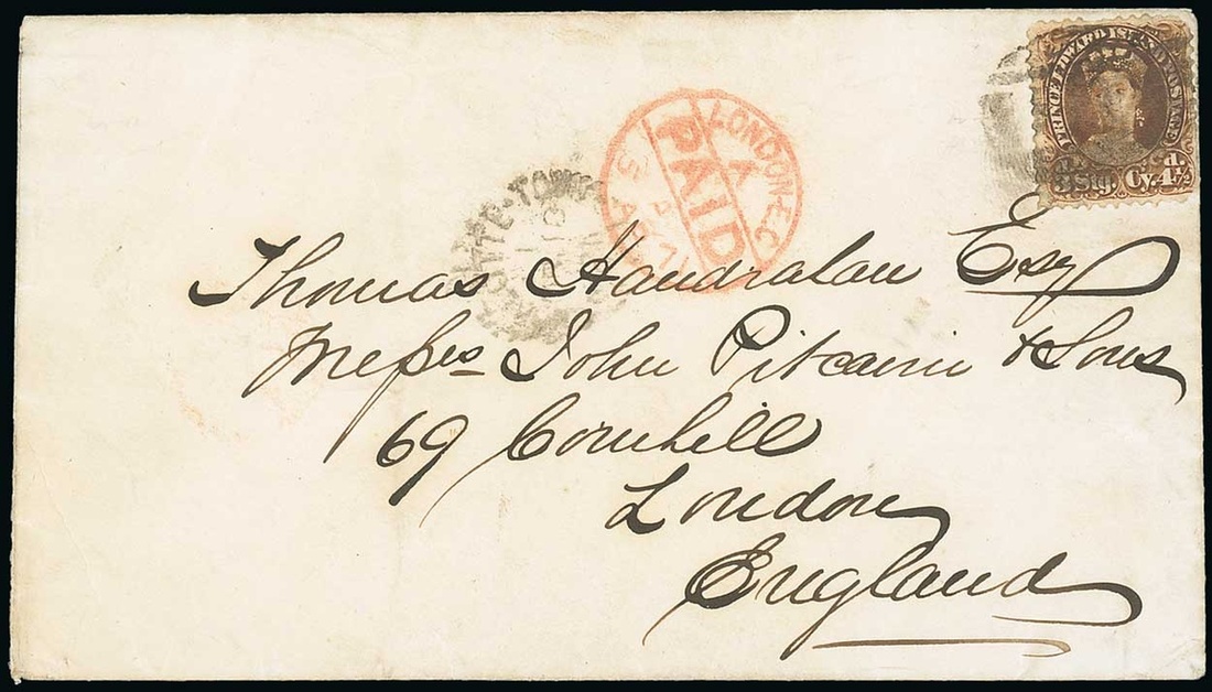 1871 (10 Mar.) envelope from Charlotte Town to London, bearing 1870 4½d. brown cancelled by "13" in oval of bars and showing despatch datestamp and London Paid datestamp (5.4) in red; the adhesive with two rounded corners and the envelope with small tear at lower left corner, nevertheless a very rare franking with this stamp used alone Only twelve covers recorded bearing this stamp. Greene Foundation Certificate (2013). Photo