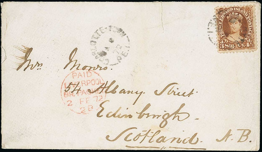 1872 (8 Jan.) envelope from Charlotte Town to Edinburgh carried on the Allen Line vessel Hibernian, bearing 1870 4½d. yellow-brown nicely centred and neatly cancelled by despatch datestamp (P80) with a further strike at left and with Paid Liverpool Br. Packet datestamp (2.2) in red below, arrival datestamp (3.2) on reverse; tear on flap onto face panel though a most attractive and rare example of this stamp used alone. Only twelve covers recorded bearing this stamp. B.P.A. Certificate (1962). Photo