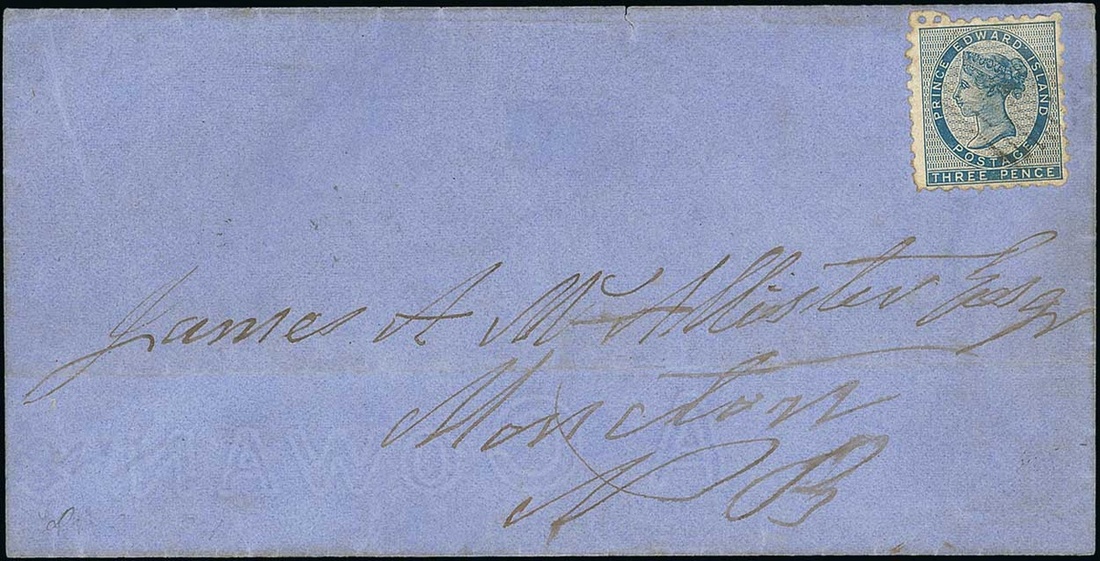 1861 (29 Dec.) entire from Charlotte Town to Moncton, bearing perf. 9 3d. blue with light oval of bars cancellation, the reverse with P5 despatch datestamp and arrival datestamp (6.1). A rare stamp used alone on cover. Photo