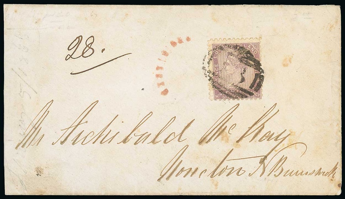 1866 (4 Jan.) envelope registered from Charlotte Town to Moncton, bearing 9d. bluish lilac clearly cancelled "13" and with curved "