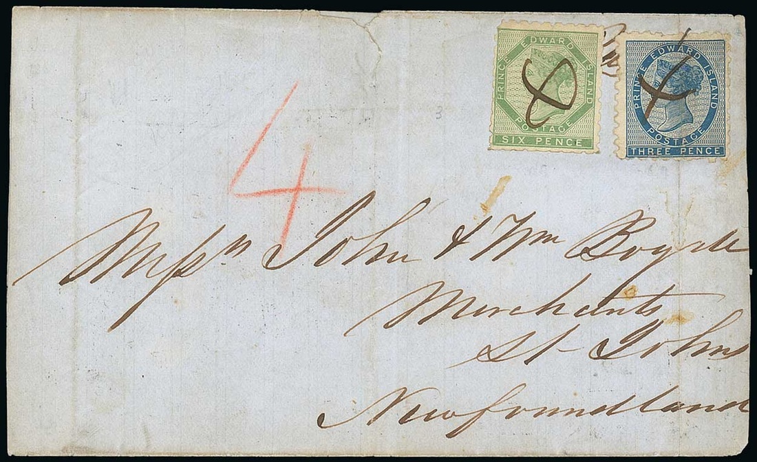 1861 (4 Jan., docketed as the day written) entire (no side flaps) from Charlotte Town to St. John's, bearing perf. 9 3d. blue and 6d. yellow-green both cancelled with a pen cross (small additional manuscript mark tying the 3d. value) and affixed over manuscript "Paid", manuscript "4" in red crayon at left the reverse with despatch (8.1) and arrival (28.1) datestamps; adhesives with faults though possibly the earliest usage of these two stamps, only issued on 1 January. Greene Foundation Certificate (2000). Photo