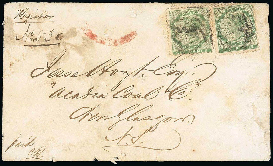1866 (28 Nov.) envelope registered from Charlotte Town to New Glasgow, marked "Register No. 530" alongside curved "