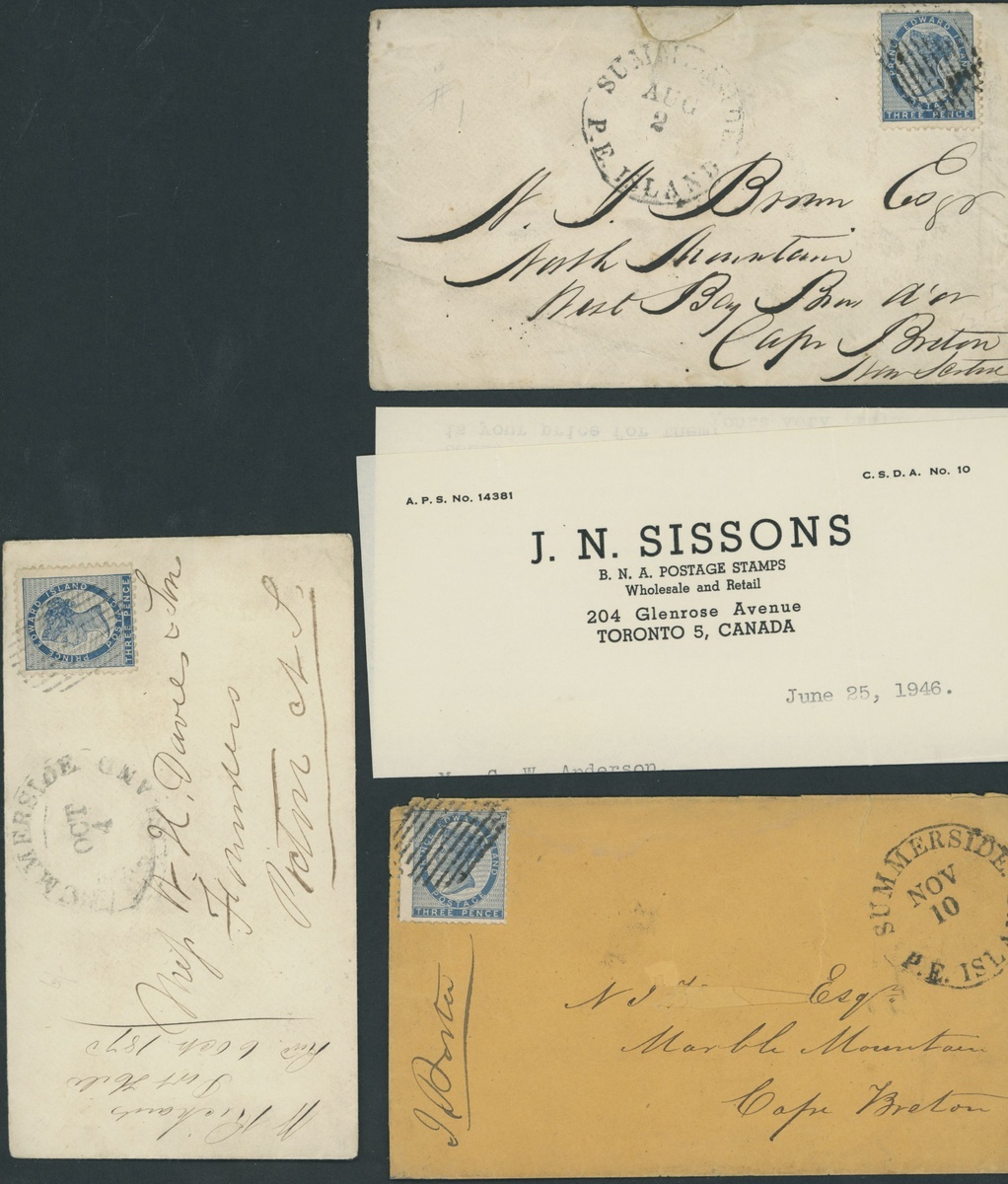 1869 (2) and 1870 envelopes from Summerside to Cape Breton (2) and Picton, each bearing 3d. blue cancelled with bars and showing despatch datestamp alongside the adhesive; two with the adhesive having a fault with one of these having the addressee excised