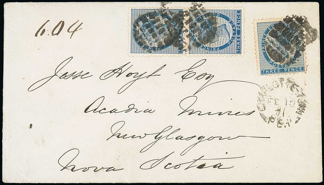 1871 (18 Feb.) envelope registered from Charlotte Town to New Glasgow, bearing perf. 11½-12 3d. blue vertical pair and a single with mute cancellations and with despatch datestamp below, manuscript registration number "604" at left, faint arrival datestamp on reverse. An unusual franking with the registration fee usually paid with a single 6d. Greene Foundation Certificate (2008). Photo