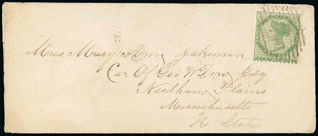 1868 c. (10 Jan.) envelope from Summerside to Needham Plains, Mass., bearing perf. 11½-12 6d. yellow-green neatly cancelled with oval of bars (P134), Summerside (P50) and P.E.I. datestamps on reverse; a most attractive cover with the 6d. rate to U.S.A. ending on 1 November 1868 when the rate was reduced to 4d.. Photo
