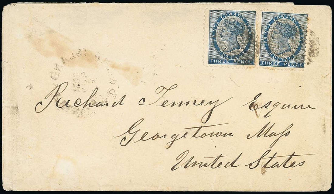 1868 (2 Apr.) envelope from Charlotte Town to Georgetown, Mass., bearing 3d. blue (2, both perf. 11 at foot and 11¾ elsewhere) both cancelled with oval of bars and showing light despatch datestamp at left; envelope with small imperfections. A very rare compound perf. franking. Photo