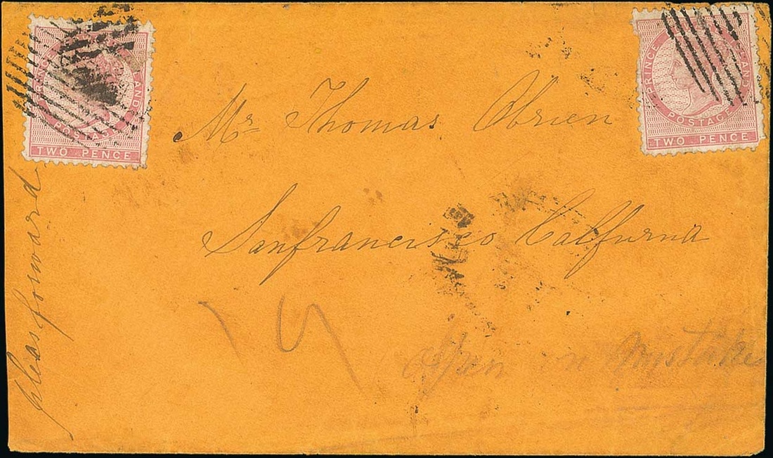 1869 (13 Apr.) orange envelope from Summerside to San Francisco, bearing perf. 11½-12 2d. rose (2, one defective) cancelled with oval of bars, despatch and P.E.I. datestamps on reverse; envelope fractionally truncated at left, otherwise sound. A very rare franking of the 4d. rate. Greene Foundation Certificate (2003). Photo