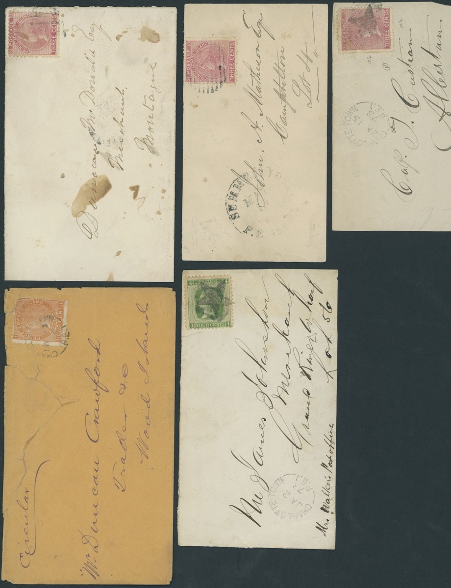 1872-73 selection of covers (9) and fronts (3), largely from Charlotte Town though with a few from Summerside and one from Belfast, nine bearing 3c. rose (three with stop between "
