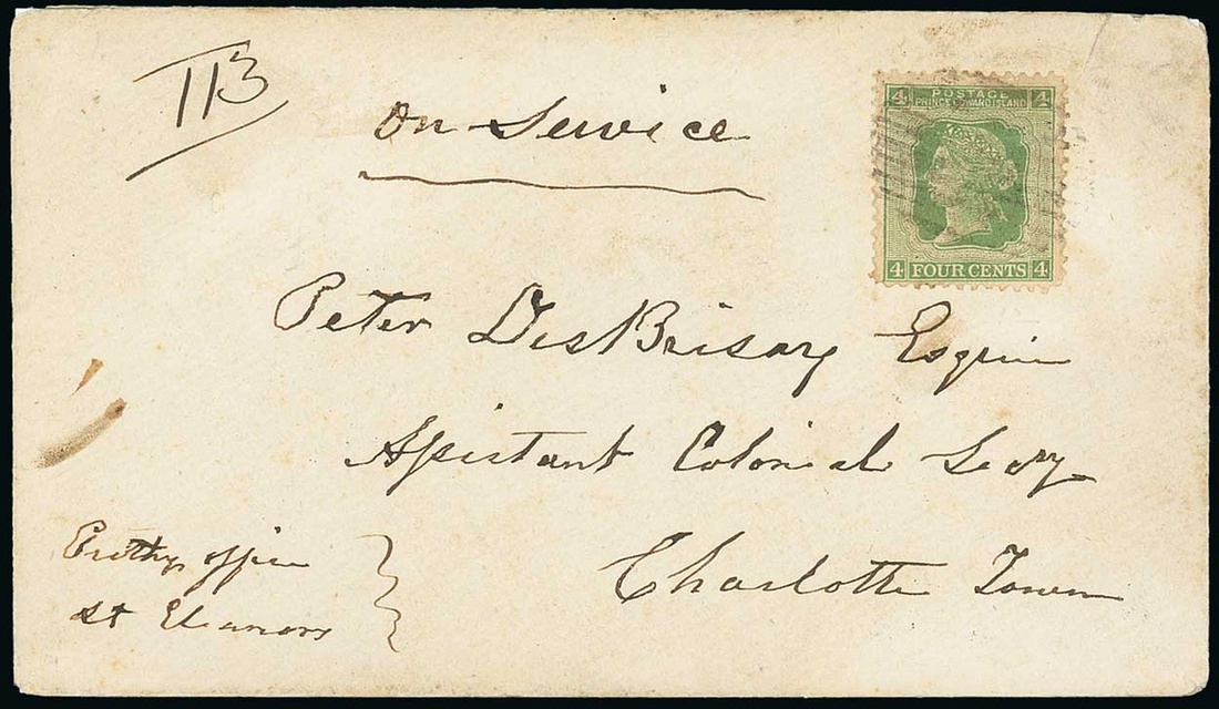 1873 (Jan.) "On Service" envelope registered from St. Eleanors to the Assistant Colonial Secretary at Charlotte Town, bearing 4c. yellow-green lightly cancelled and tied by oval of bars; arrival datestamp (3.1) on reverse from which a circular piece around flap has been cut away. A unique franking with the postage free due to being and Official cover and with the registration fee paid for by the 4c. stamp. R.P.S. Certificate (1962). Photo