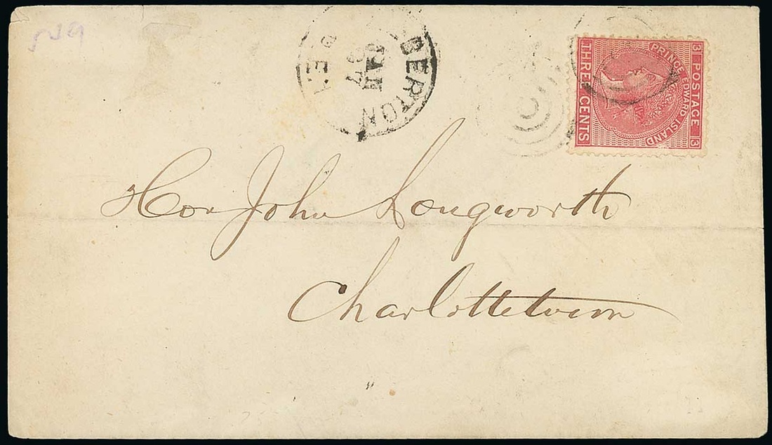1873 (27 Jan.) envelope from Alberton to Charlotte Town, bearing 3c. rose tied by two strikes of the four-ring target (P121) and showing despatch datestamp (P55) alongside, arrival datestamp (28.1) on reverse; horizontal crease well clear of the adhesive. Rare, being one of only two recorded examples. Photo