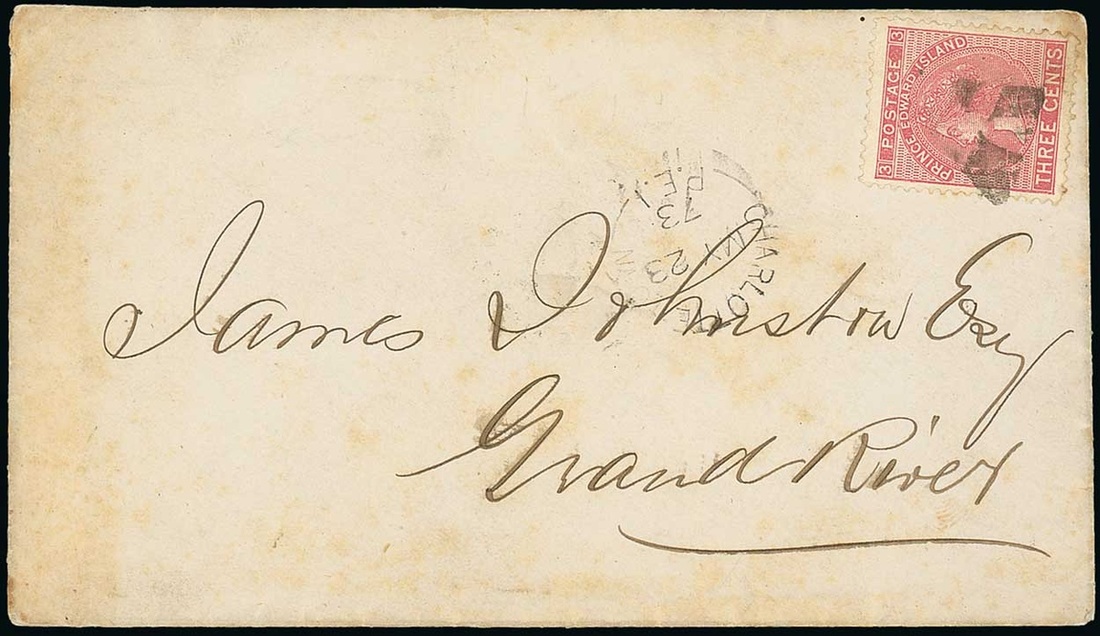 1873 (23 May) envelope from Charlotte Town to Grand River, bearing 3c. rose tied by segmented wedge cork cancellation (P127) and with despatch datestamp alongside, the reverse (flap faults) with indistinct arrival? datestamp. Rare with less than ten examples recorded. Philatelic Foundation Certificate (1999). Photo