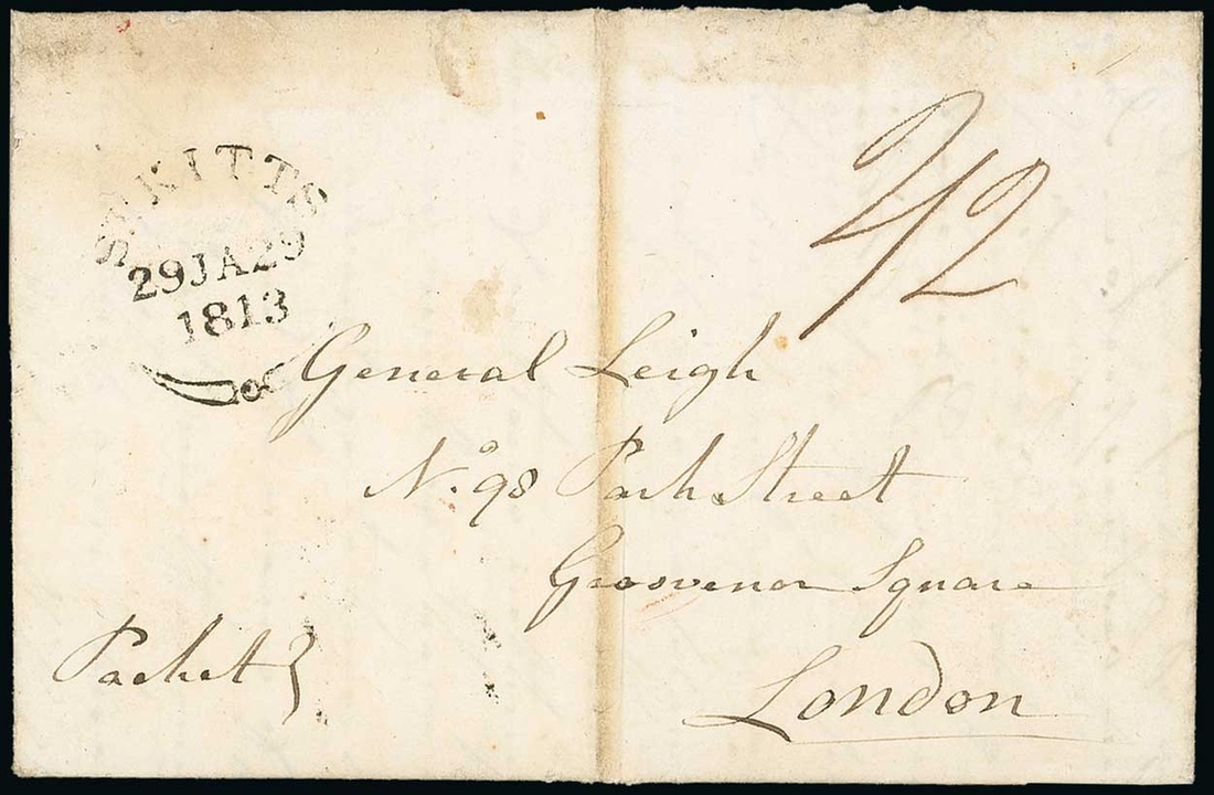 1813 (29 Jan.) entire letter ex the "General Leigh" correspondence to London, rated "2/2", showing fine