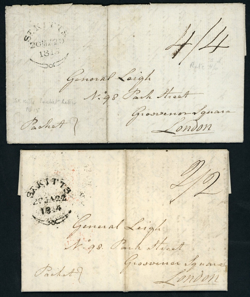 1814 (22 Jan.) and 1815 (20 May) entire letters ex the "General Leigh" correspondence to London, rated "2/2" and "4/4" respectively, both showing mainly fine