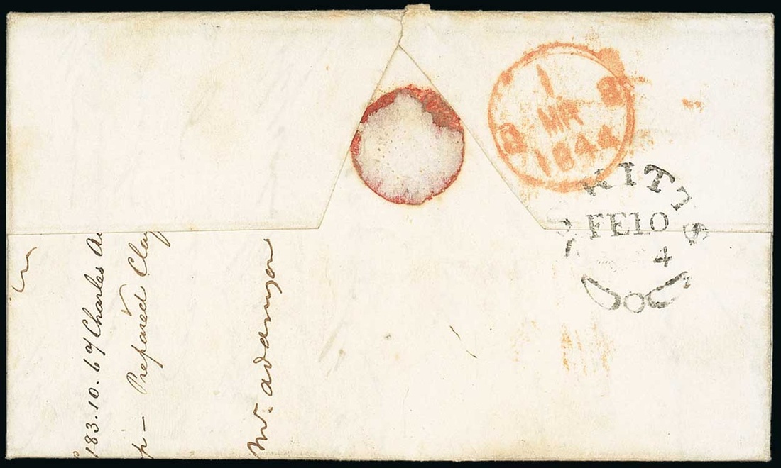 1844 (10 Feb.) entire letter to London, rated "1/-" and showing, on reverse across join, fine