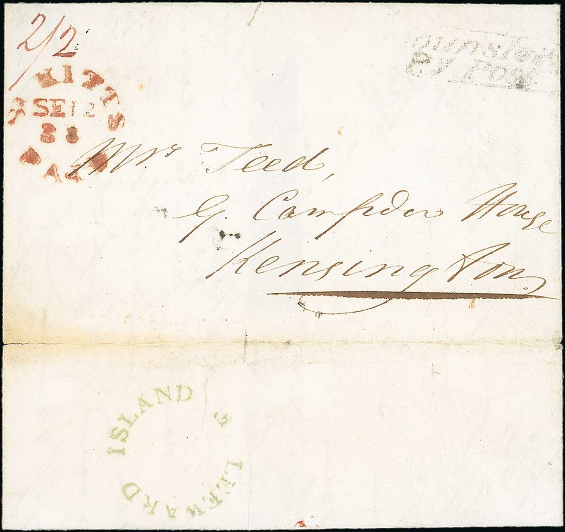 1838 (12 Sept.) entire ex the "Teed" correspondence to Kensington, rated "2/2" in red, showing fine though slightly overinked