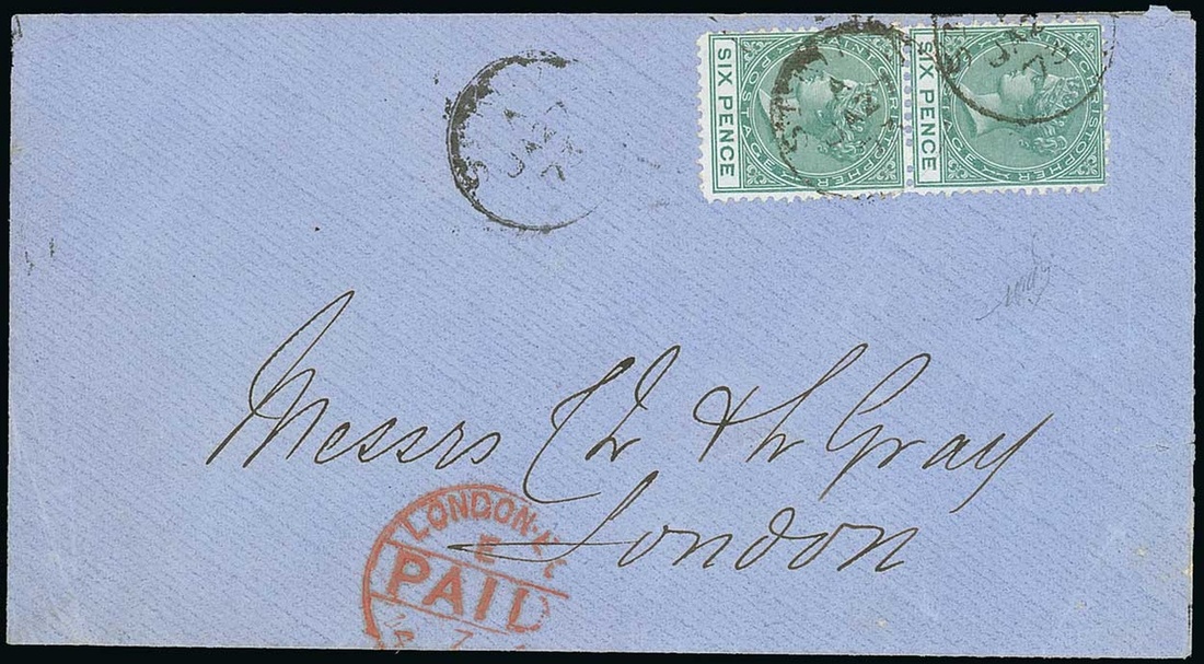 1873 (27 Jan.) double rate envelope to London, bearing 6d. green vertical pair placed sideways and tied by St. Kitts c.d.s. and showing red Paid arrival datestamp. A rare franking. Photo