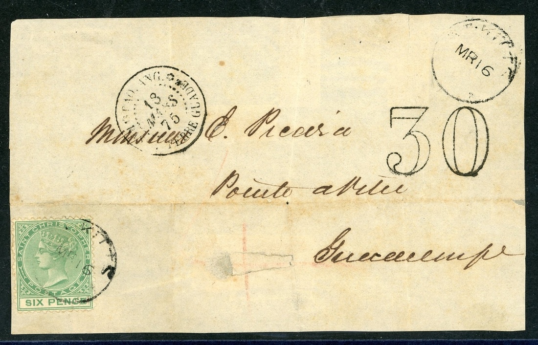 1875 (16 Mar.) front to Guadeloupe, bearing 6d. green tied by St. Kitts c.d.s., showing arrival datestamp (18.3) and handstruck "30" (delivery charge)