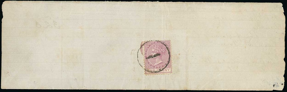 1876 statement (split into four parts) of account of the revenue for the island of St. Kitts during the year 1876 which amounted to just over thirty thousand pounds, bearing 1d. magenta paying the local letter rate, clearly tied by dumb obliterator. A rare franking. Photo