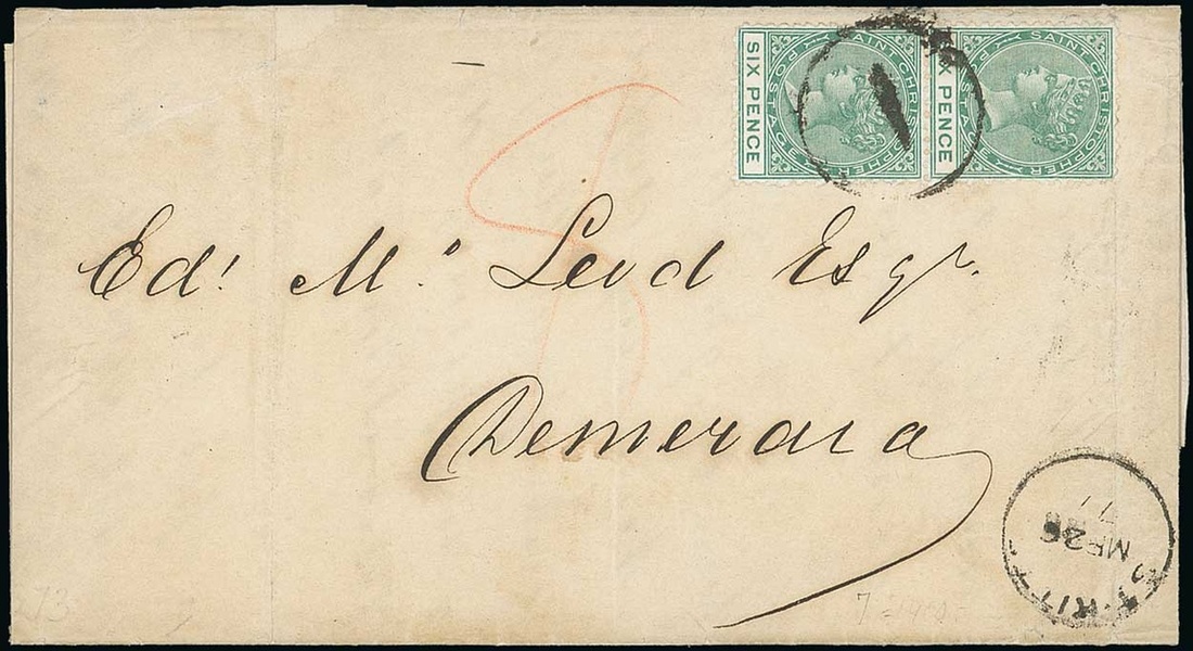 1877 (26 Mar.) treble rate entire letter to Demerara, bearing 6d. green vertical pair placed sideways and tied by dumb obliterator, showing St. Kitts c.d.s. at lower right with Georgetown arrival datestamp (3.4) on reverse. A rare franking to a most unusual destination. Photo