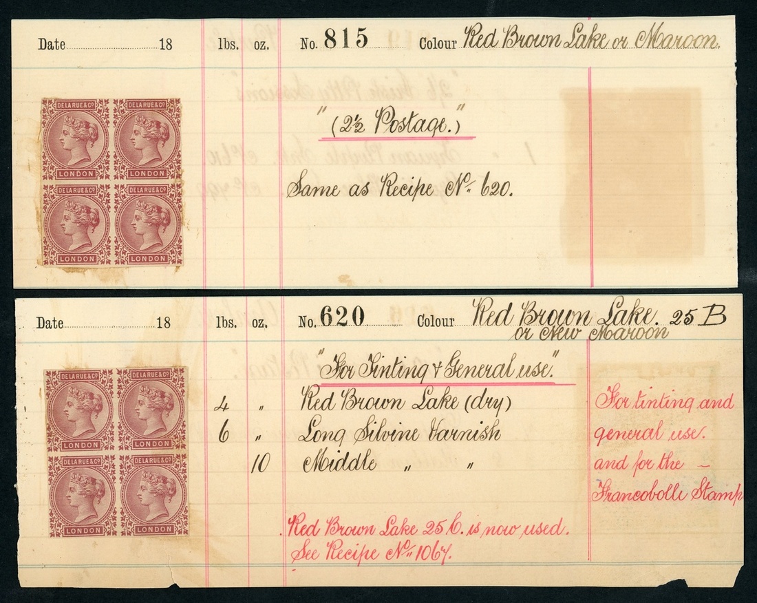 De La Rue dummy stamps blocks of four (2) in maroon, each affixed to piece giving details of the ink recipe for the 2½d. red-brown in slightly differing shades,  fine