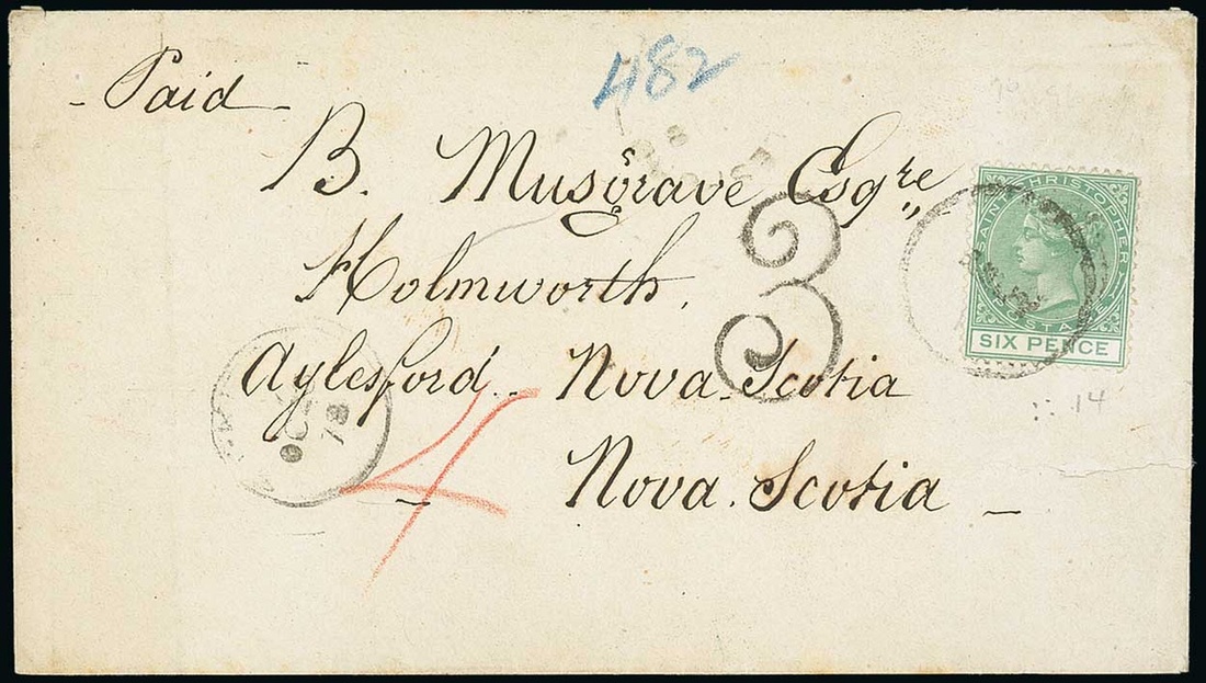 1878 (28 Oct.) envelope to Nova Scotia, bearing 6d. green tied by dumb obliterator, showing red crayon "4", St. Kitts c.d.s. and handstruck "3" with Halifax datestamp (16.11) on reverse; the envelope with 28mm. tear below adhesive. Photo