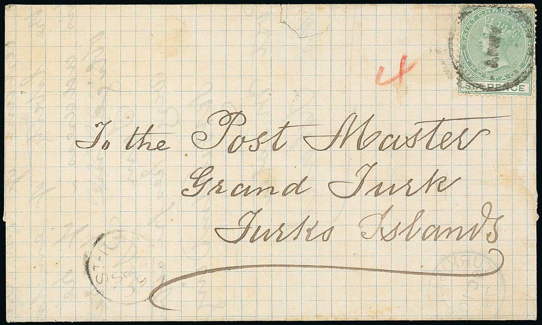 1879 (11 Sept.) entire letter to Turks Islands, bearing 6d. green tied by dumb obliterator, showing red crayon "4" and St. Kitts c.d.s. with, on the inside, fine Turks Island c.d.s. (10.10); small tear at top of face panel. Photo
