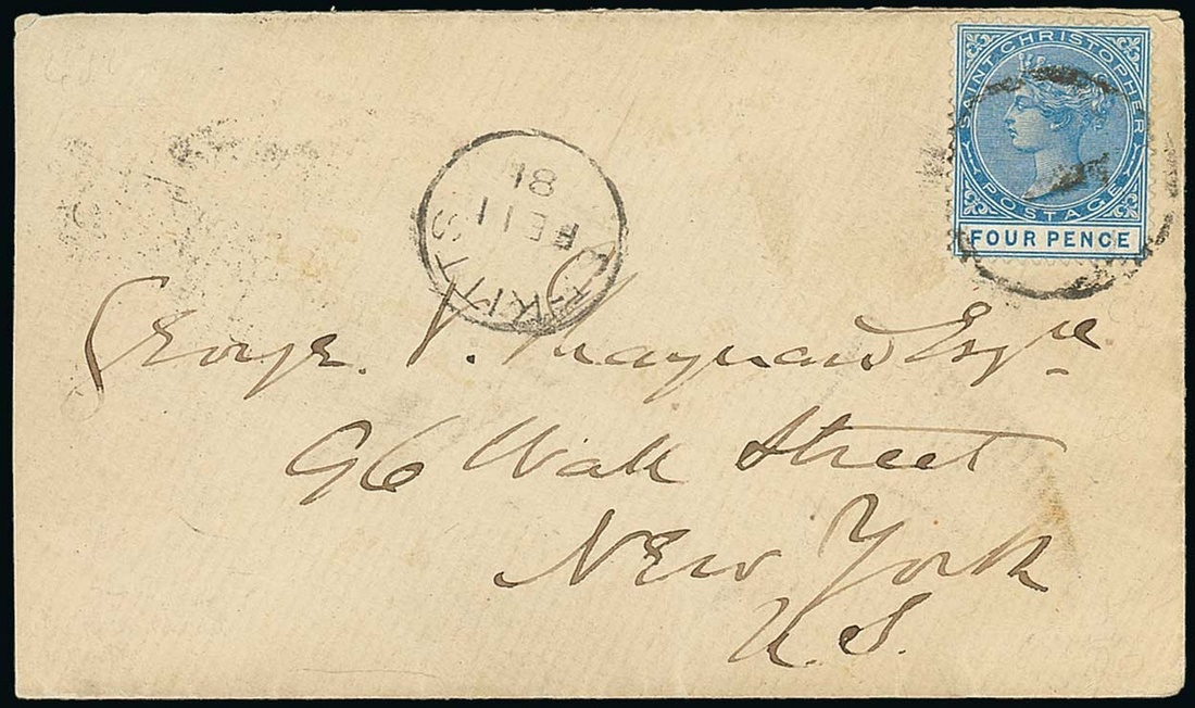 1881 (11 Feb.) envelope to New York, bearing 4d. blue tied by dumb obliterator, showing St. Kitts c.d.s. with arrival datestamp on reverse. Photo