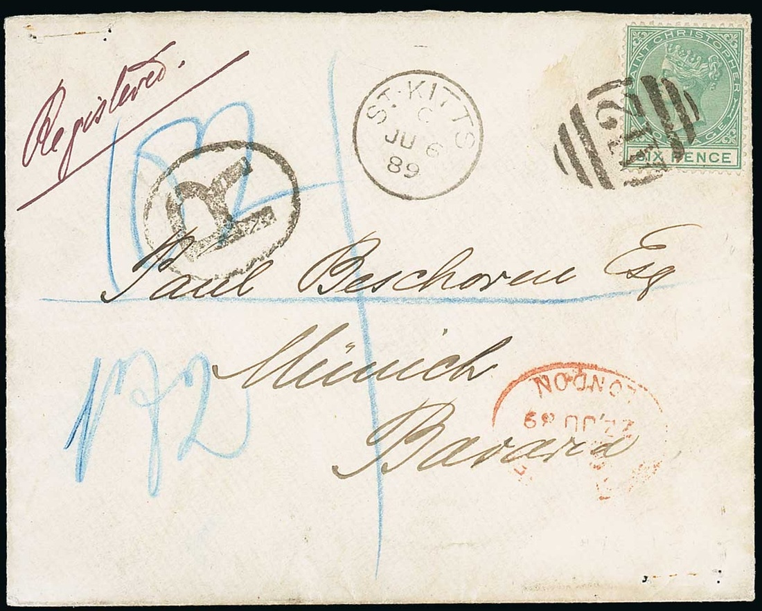 1889 (6 June) envelope registered to Munich, bearing 6d. green clearly tied by "A12" obliterator, showing