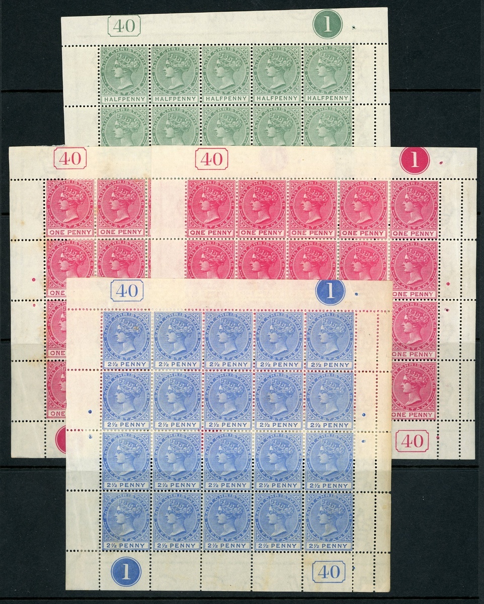 ½d., 1d. carmine-rose (2, one stained and missing pieces of selvedge), 2½d. ultramarine and 4d. grey (4), each in a complete mint sheet of twenty