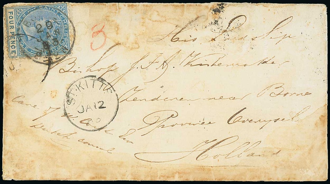 1883 (12 Jan.) envelope to Holland, addressed to "His Lordship Bishop J.F.H. Mislemores care of the Dutch Consul at Borne", bearing 4d. blue tied by two strikes of