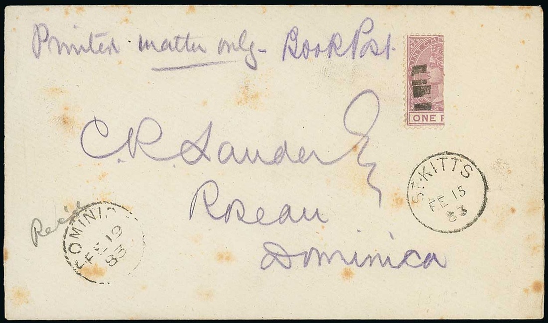 1883 (15 Feb.) envelope to Dominica, marked "Printed matter only - Book Post", bearing 1d. dull magenta bisected vertically and cancelled by dumb obliterator, and showing St. Kitts and arrival (19.2) datestamps; some stain spots. Very rare. S.G. 12a, unpriced. Photo