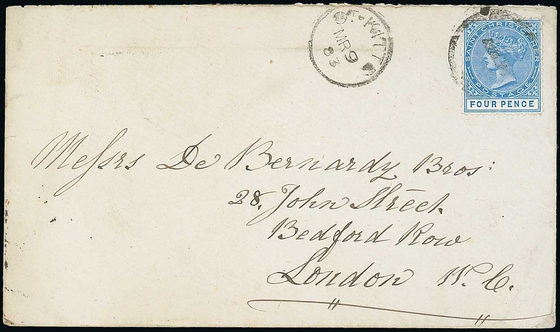 1883 (9 Mar.) envelope ex the "De Bernardy" correspondence to London, bearing 4d. blue tied by dumb obliterator, showing St. Kitts c.d.s. alongside with arrival datestamp (31.3) on reverse. Photo