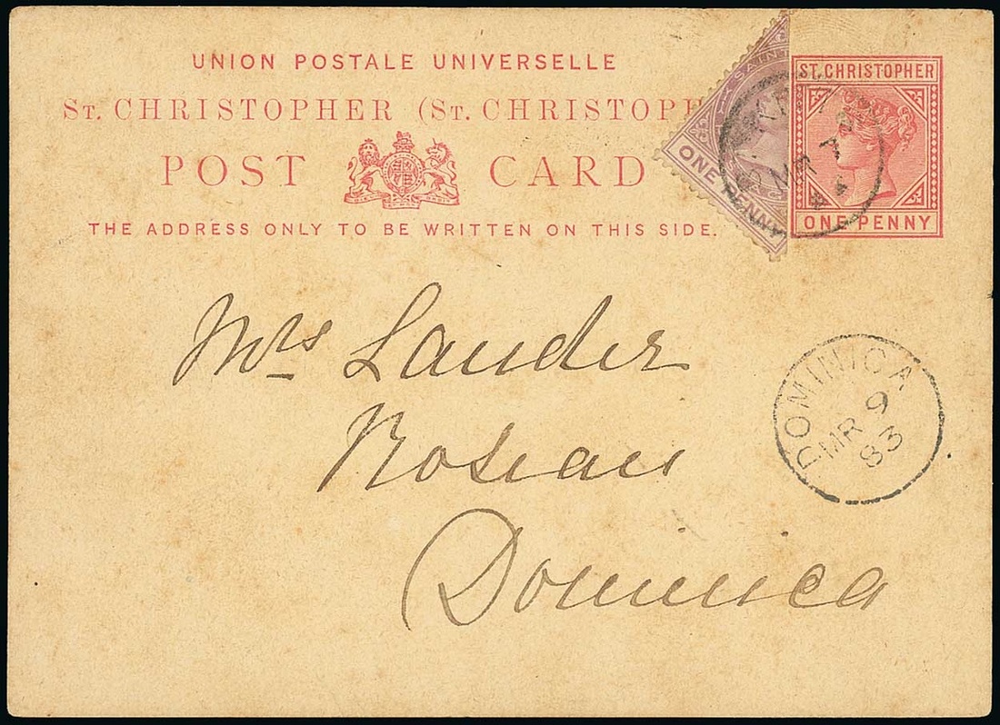 1883 (7 Mar.) 1d. stationery card to Dominica, uprated with 1d. dull magenta bisected diagonally, clearly cancelled by light St. Kitts c.d.s. and showing arrival datestamp (9.3) below; some light and minor soiling. Very rare. S.G. 12a, unpriced. Photo