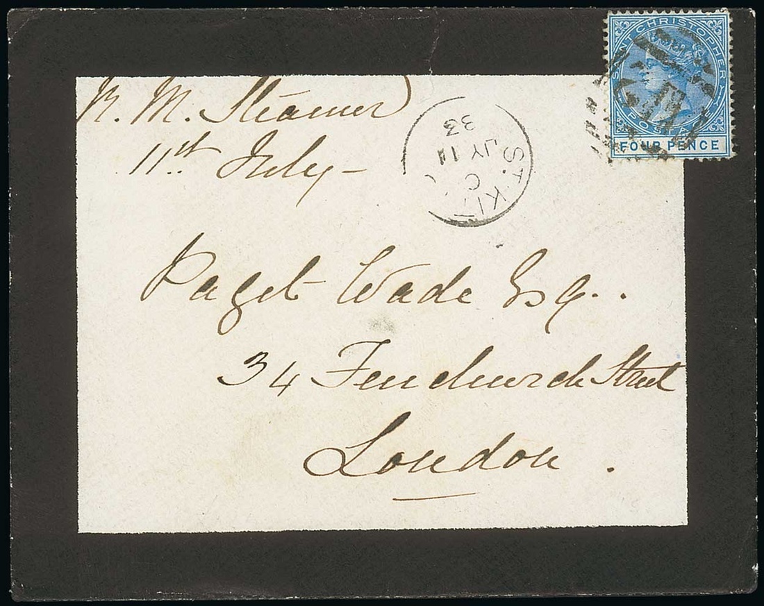 1883 (11 July) envelope ex the "Wade" correspondence to London, bearing 4d. blue neatly tied by "A12" obliterator, showing St. Kitts c.d.s. alongside with red arrival datestamp on reverse. Photo