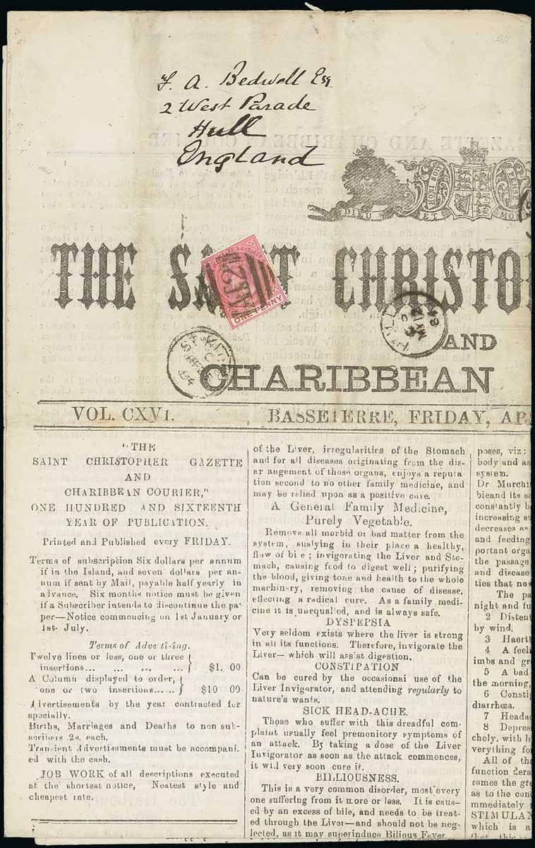 1884 (25 Apr.) complete "The Saint Christopher Gazette and Charibbean Courier" newspaper dated 11 April, addressed to Hull, bearing 1d. rose-carmine tied by "A12" obliterator and showing St. Kitts and arrival (12.5) datestamps alongside; fine condition and very rare. Photo