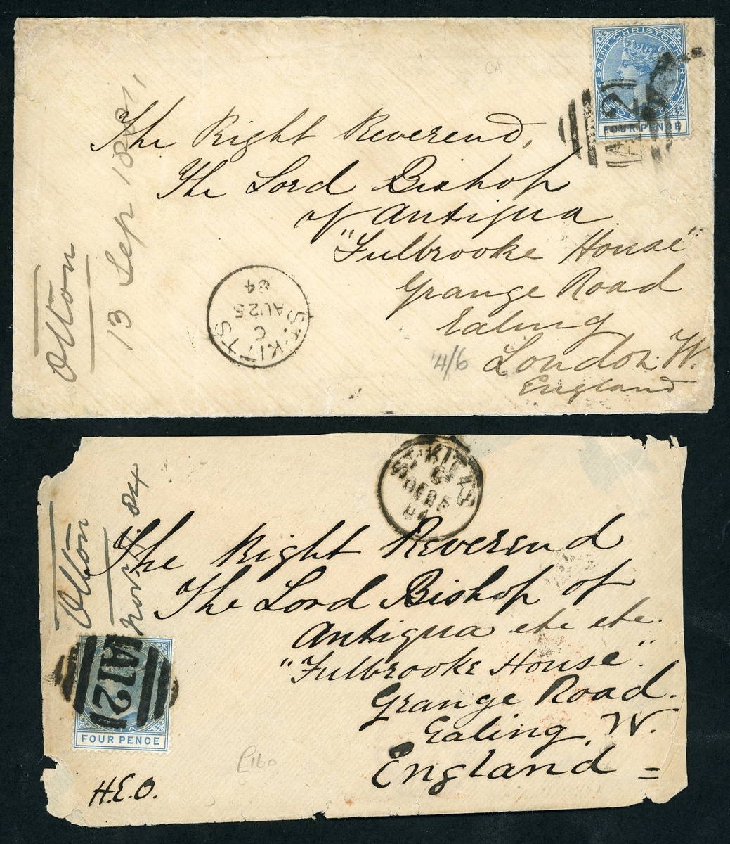 1884 (25 Aug.) and (25 Oct.) envelopes to the Right Reverend the Lord Bishop of Antigua in London, both bearing 4d. blue tied by "A12" obliterator and showing St. Kitts c.d.s.; both envelopes with faults